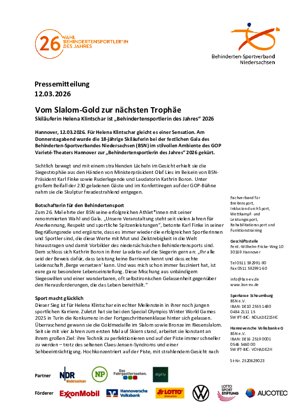 Für Helena Klintschar gleicht es einer Sensation. Am Donnerstagabend wurde die 18-jährige Skiläuferin bei der festlichen Gala des Behinderten-Sportverbandes Niedersachsen (BSN) im stilvollen Ambiente des GOP Varieté-Theaters Hannover zur „Behindertensportlerin des Jahres“ 2026 gekürt.